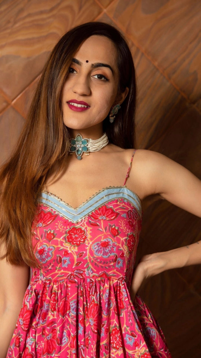 ADHYA FLORAL HAND BLOCK PURE COTTON ANARKALI SET - Pomcha Jaipur