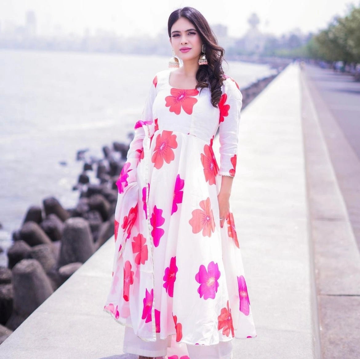 CARNATION OFF WHITE CHANDERI SILK ANARKALI SET WITH ORGANZA DUPATTA - Pomcha Jaipur