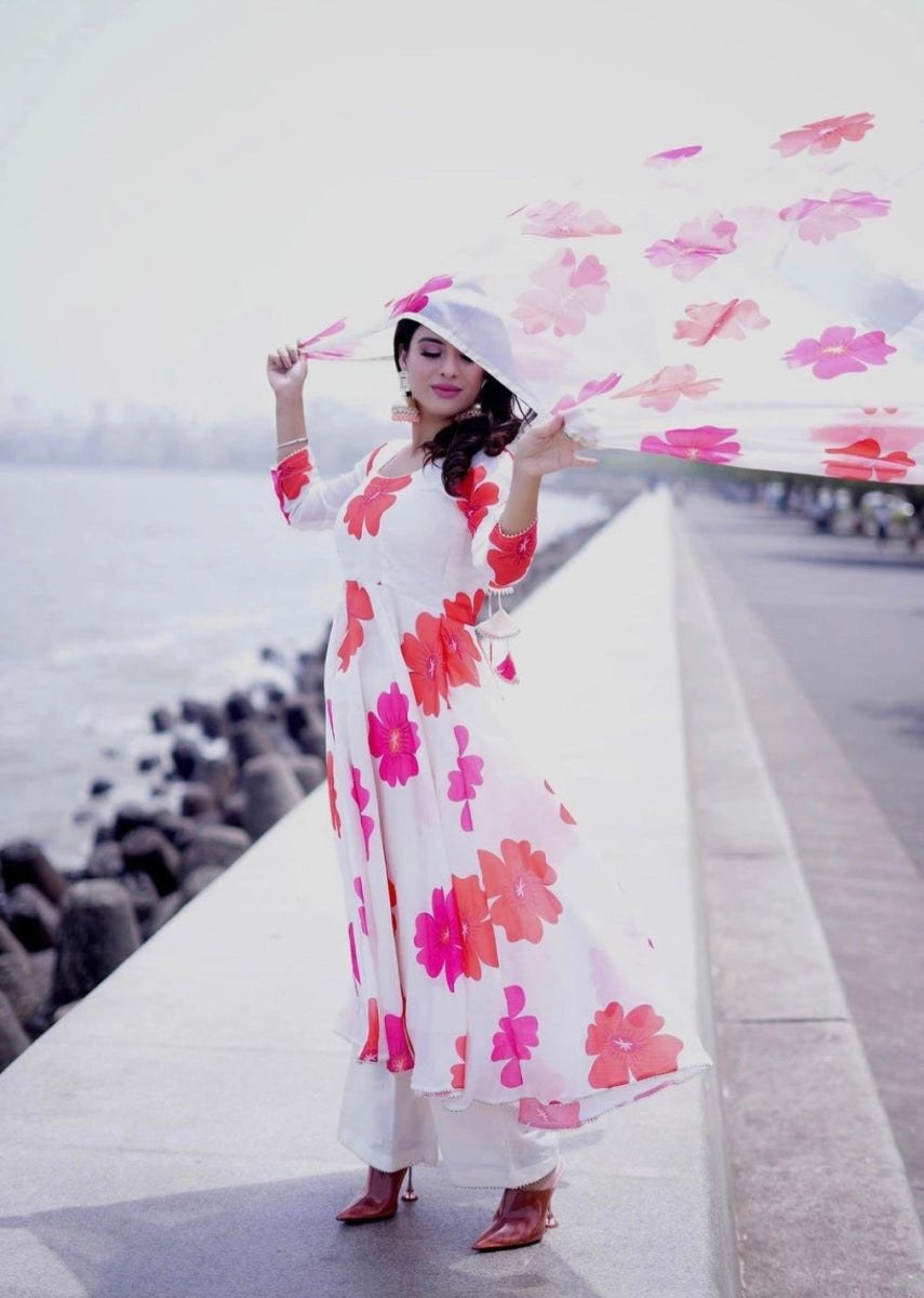 CARNATION OFF WHITE CHANDERI SILK ANARKALI SET WITH ORGANZA DUPATTA