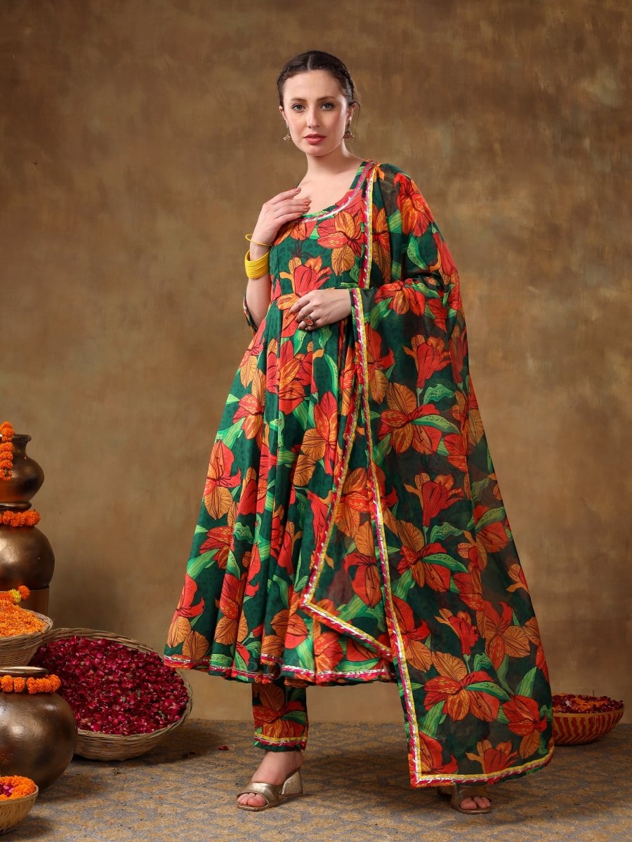 MERAKI TOOBA GREEN FLORAL PRINT MUSLIN ANARKALI WITH ORGANZA DUPATTA - Pomcha Jaipur