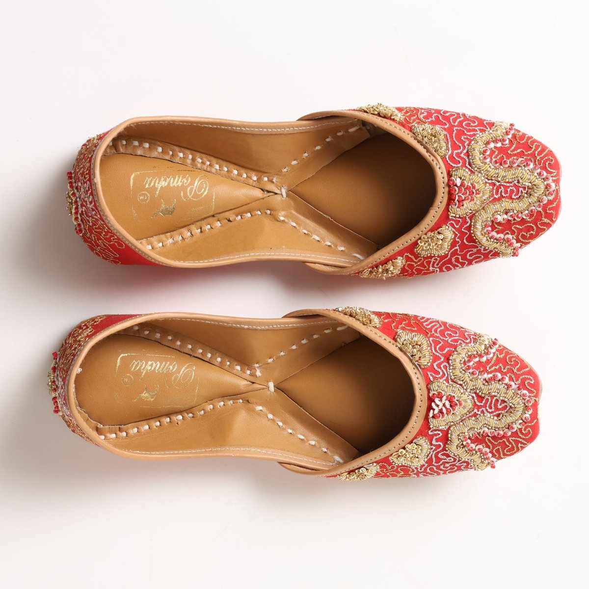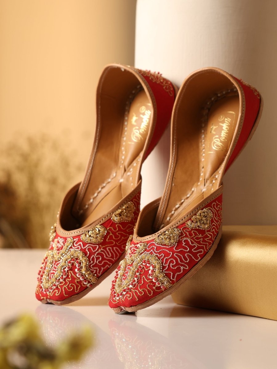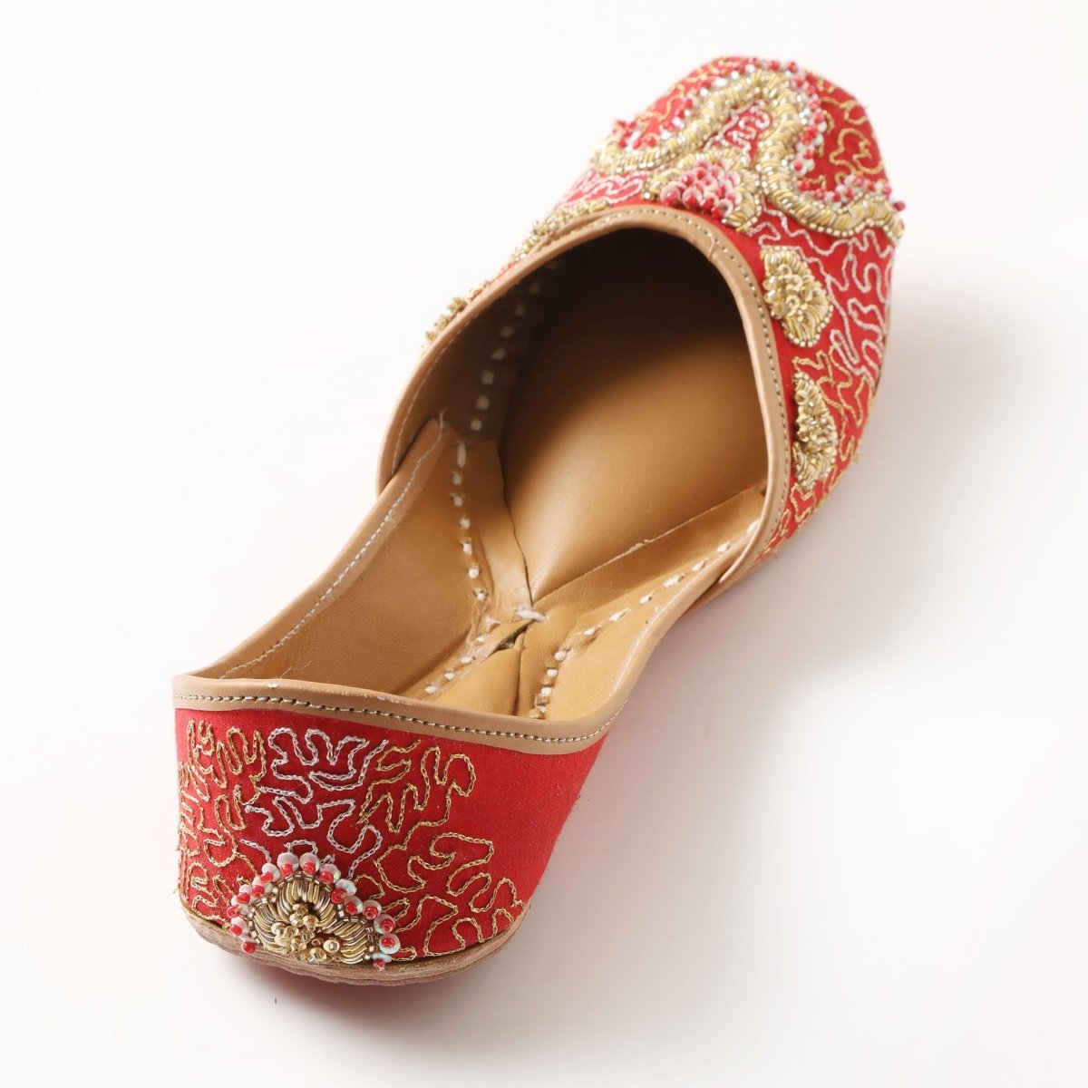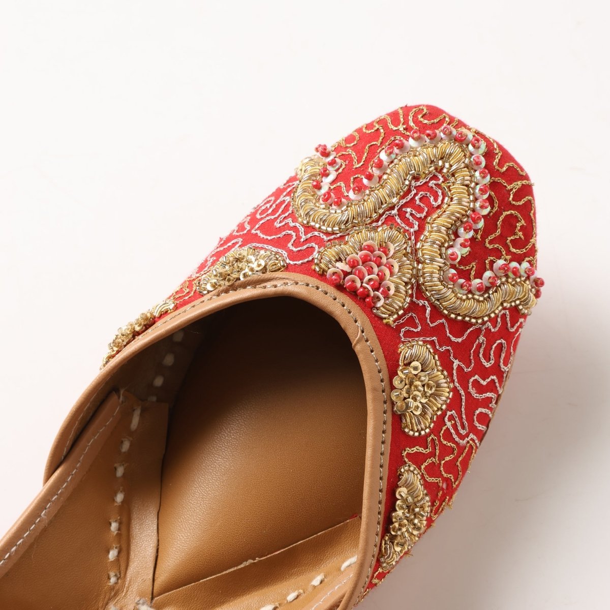 This astonishing piece of bold red jutti which will make your feet & outfit feel stylish & empowering. Embedded with beads & crafted with zari.