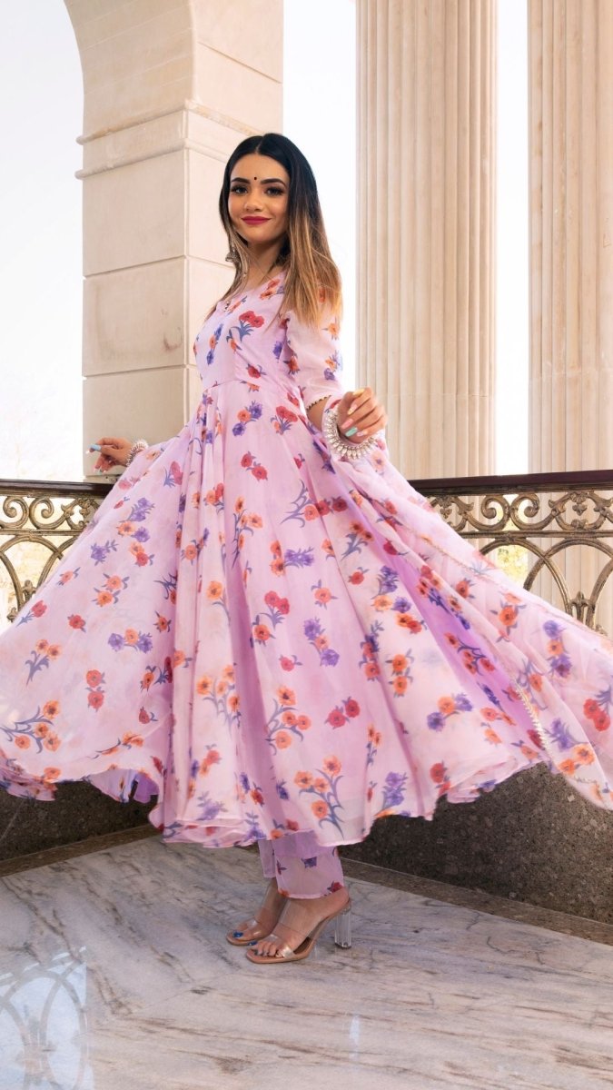 - LAVENDER GANGAUR PRINTED ORGANZA ANARKALI WITH ORGANZA DUPATTA