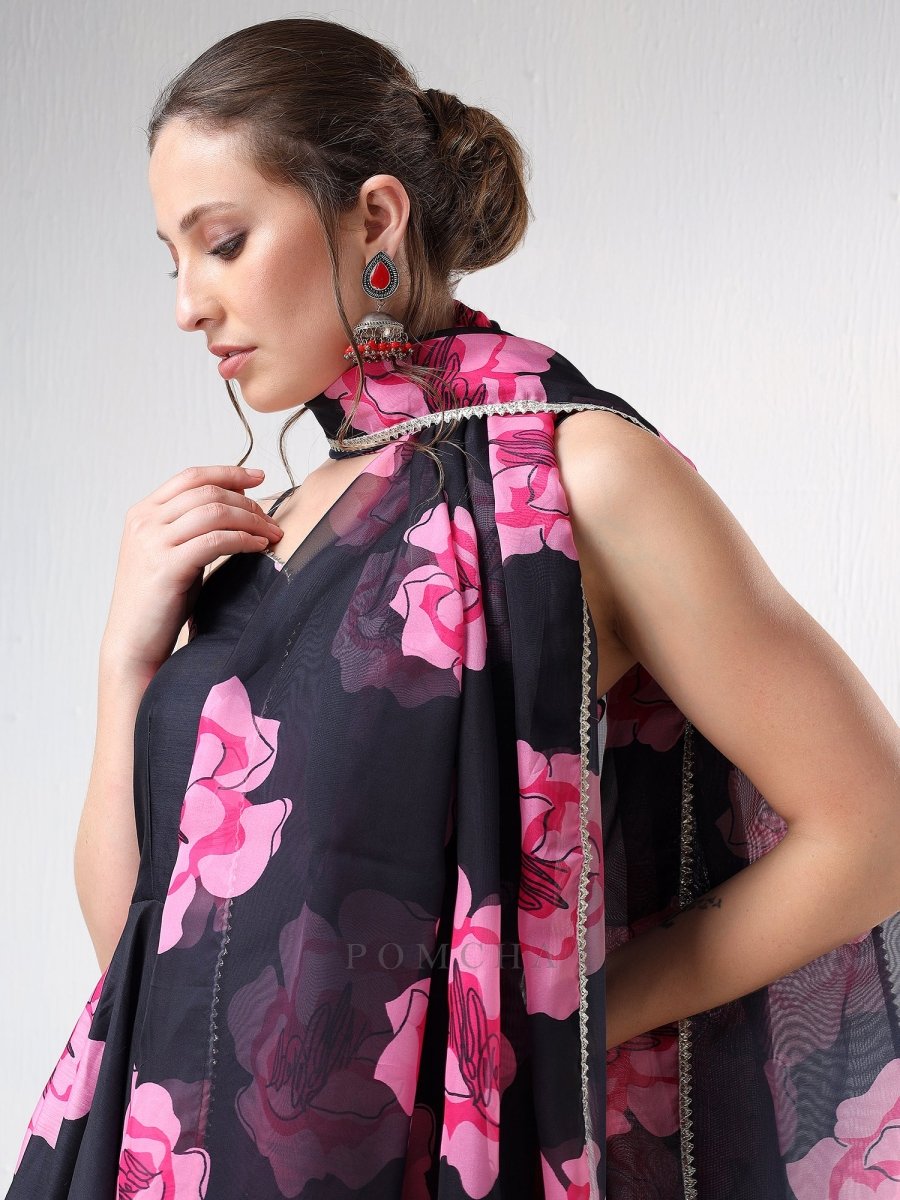 - SADABHAR BLACK CARNATION MUSLIN ANARKALI SET WITH ORGANZA DUPATTA