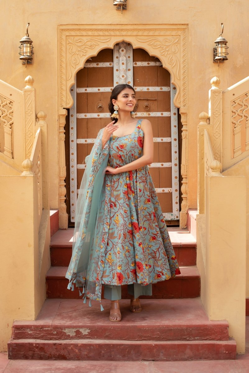 - CHHIPA BAZAR GREY HAND BLOCK COTTON ANARKALI WITH SOFT NET DUPATTA