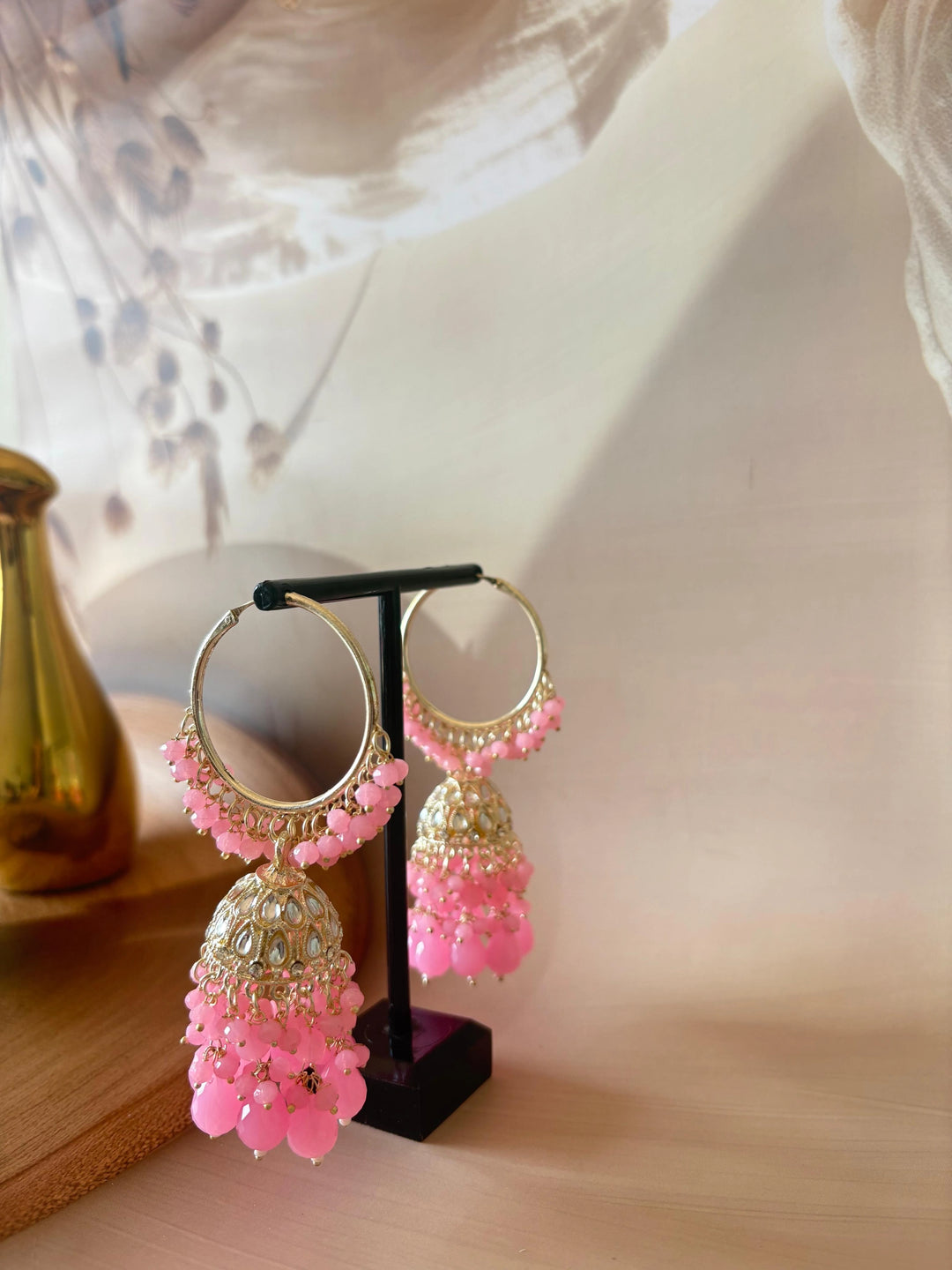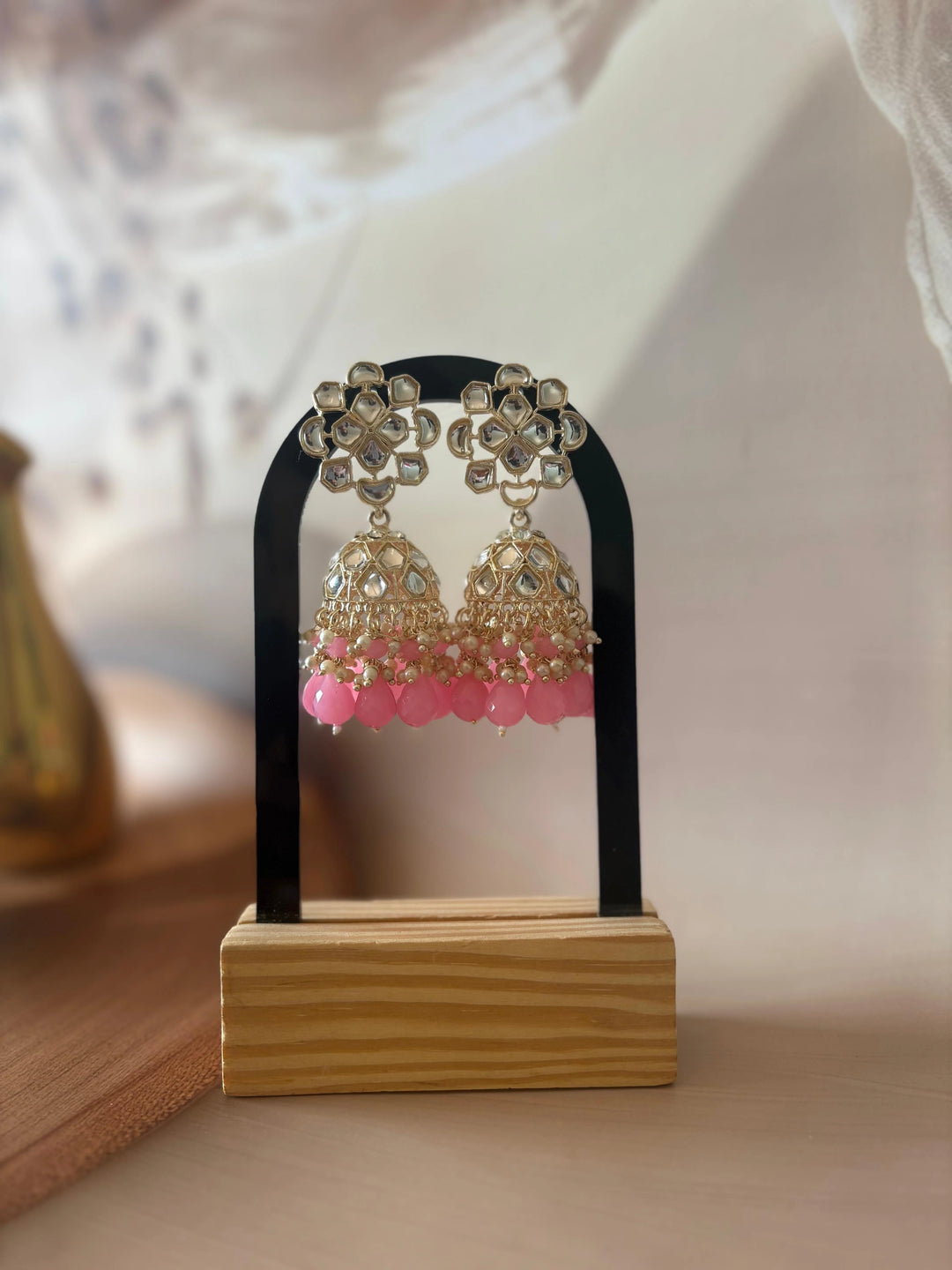 GOLD AND SILVER TONE PINK STONE BEADED JHUMKI EARRING SET