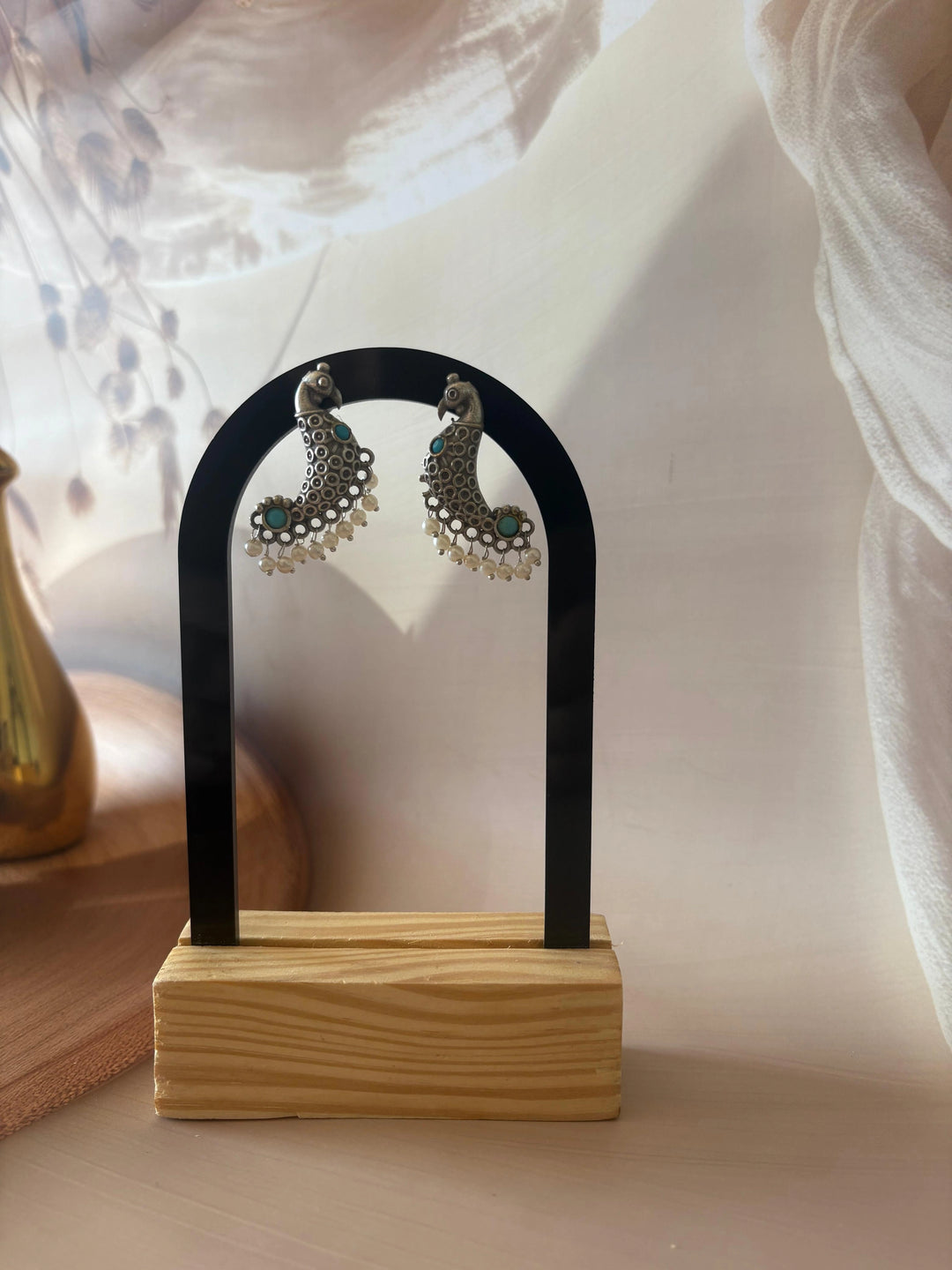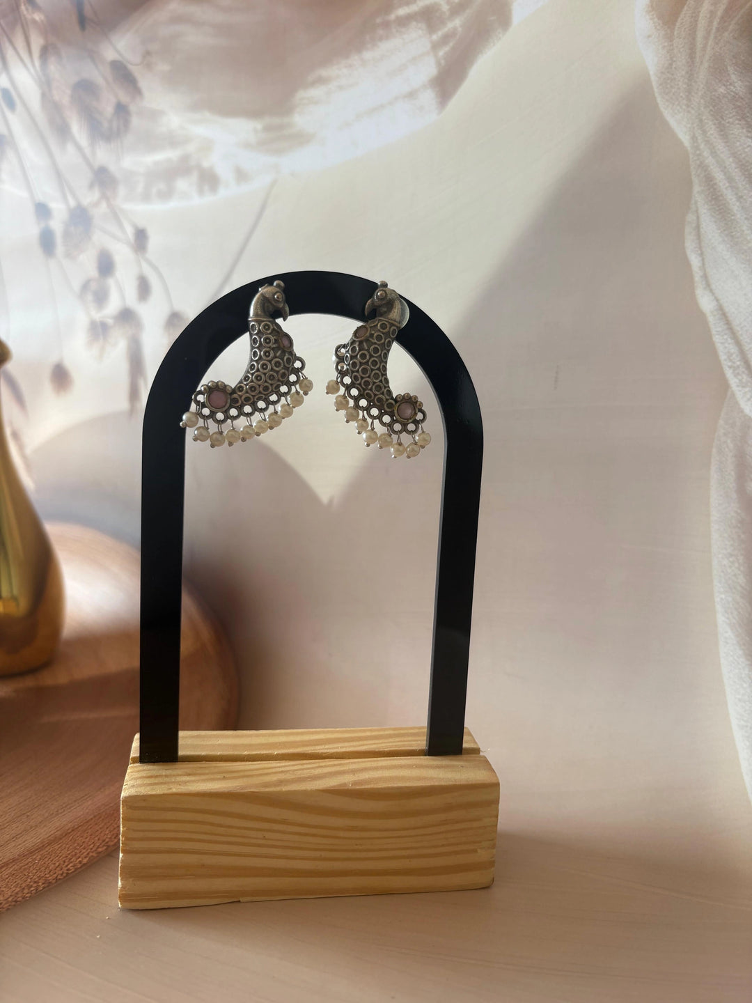 PEACH SILVER OXIDISED PEACOCK SHAPE EARRING SET