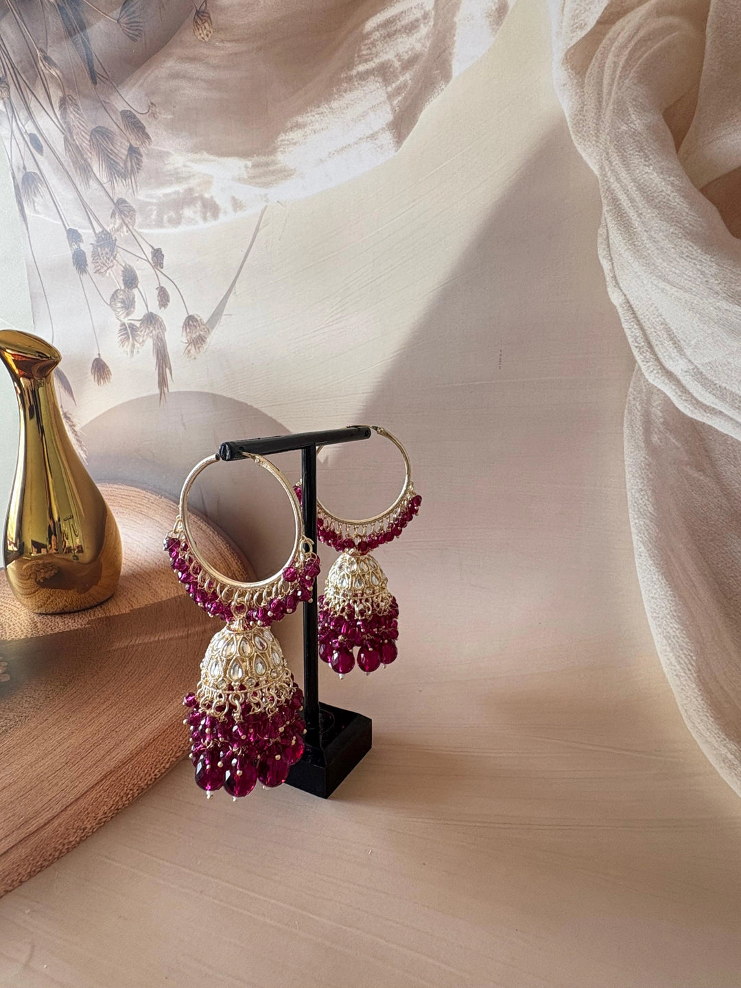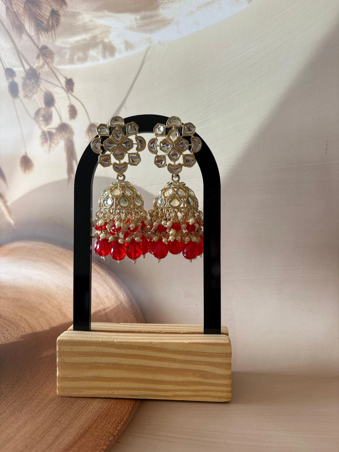 GOLD AND SILVER TONE RED STONE BEADED JHUMKI EARRING SET