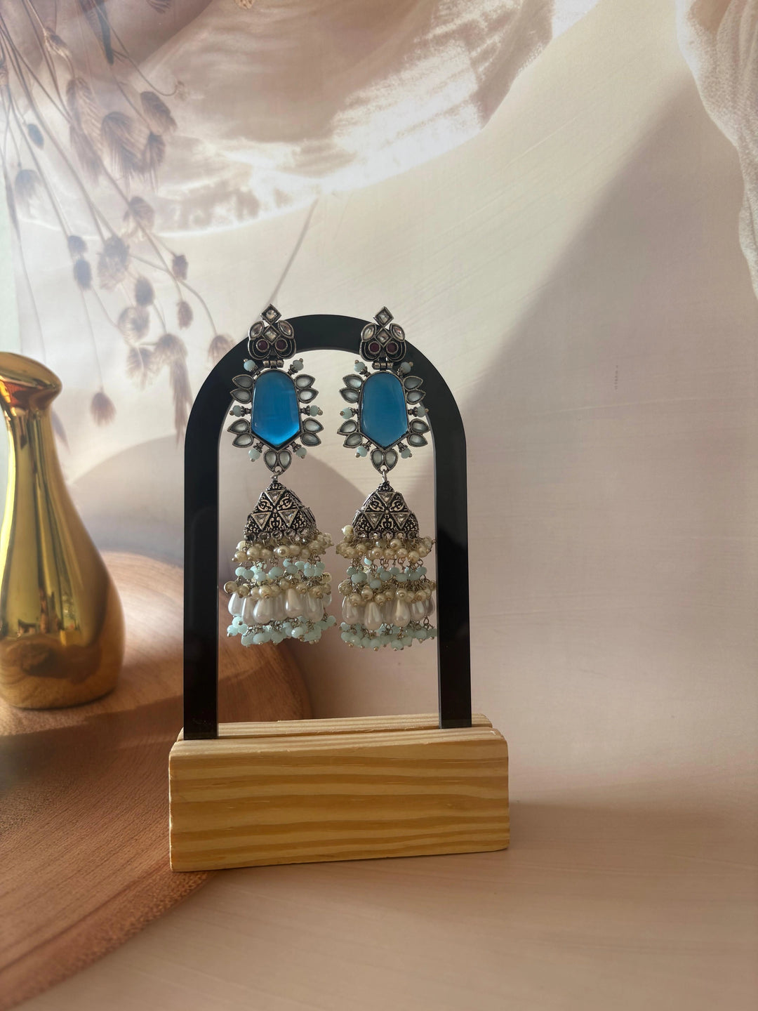 LIGHT BLUE STONE SLIVER OXIDISED PEARL EARRING SET
