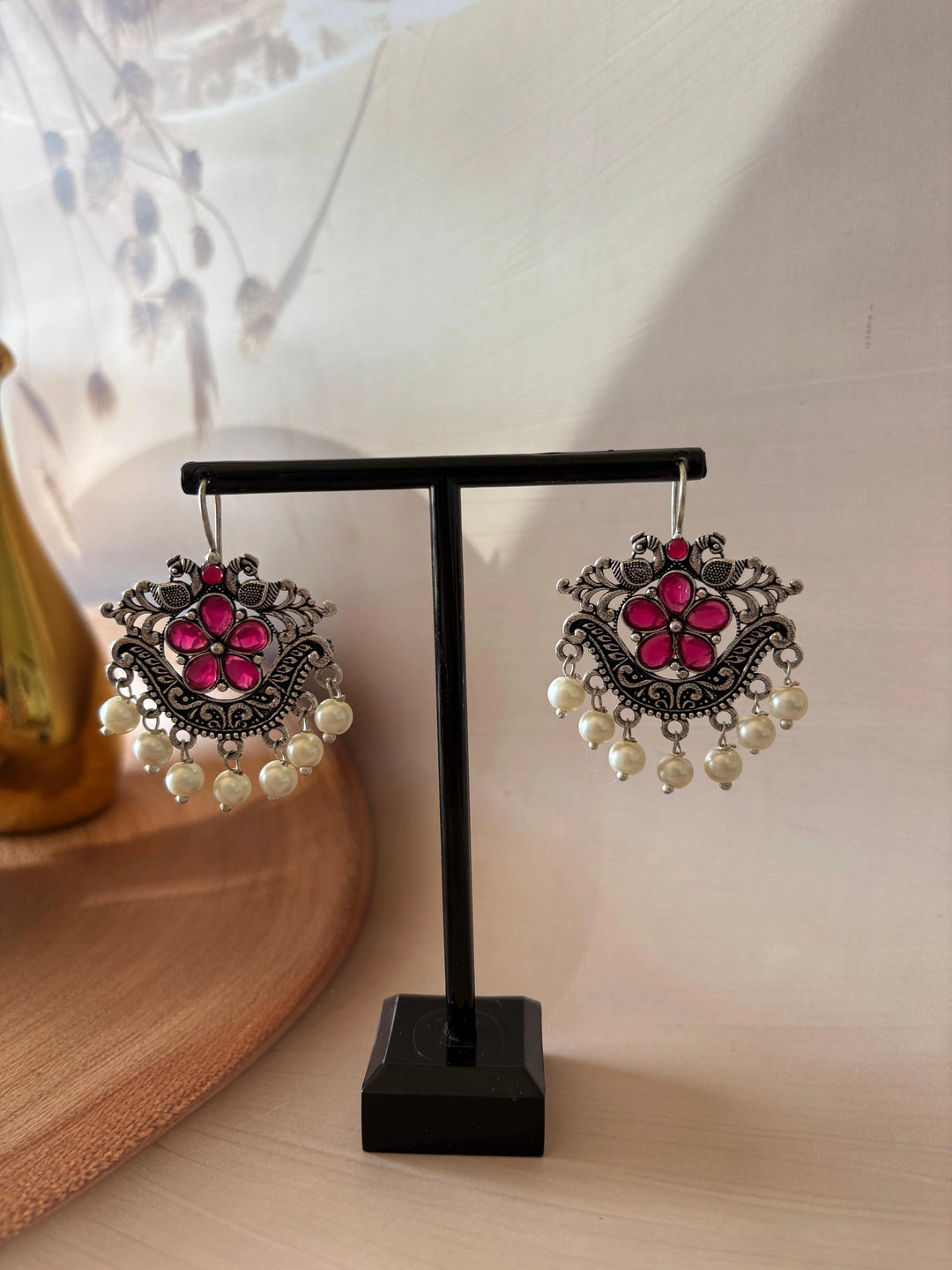 PEACOCK GREEN RED STONE SILVER OXIDISED EARRING