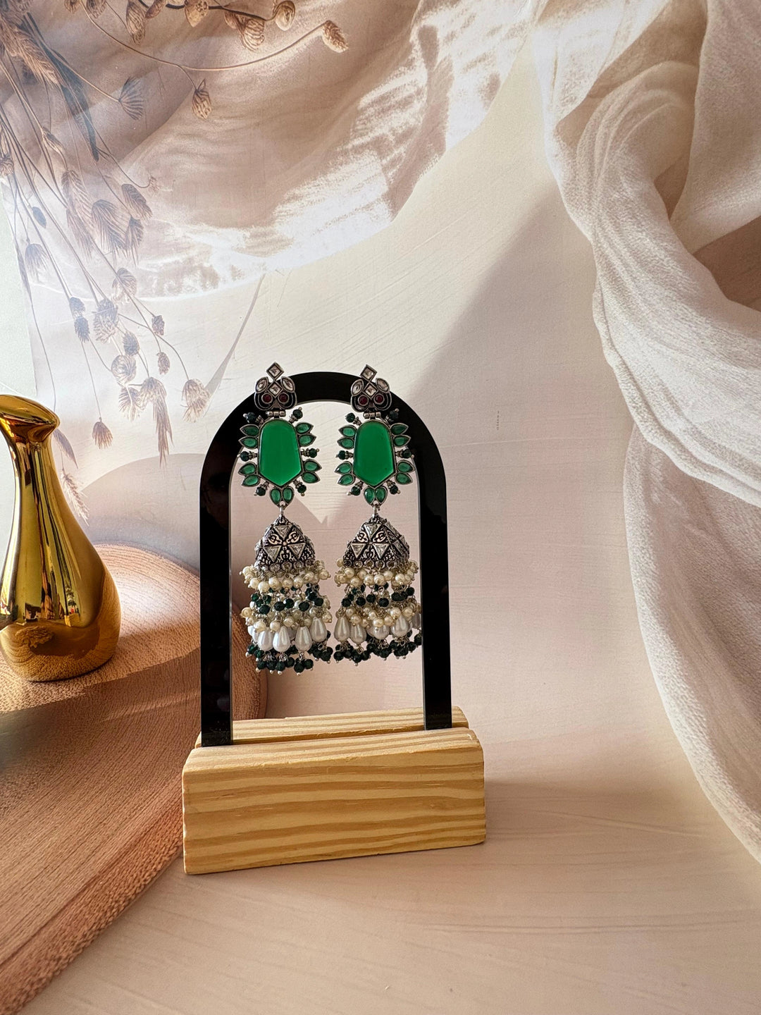 MANJARI STONE SILVER OXIDISED JHUMKA SET