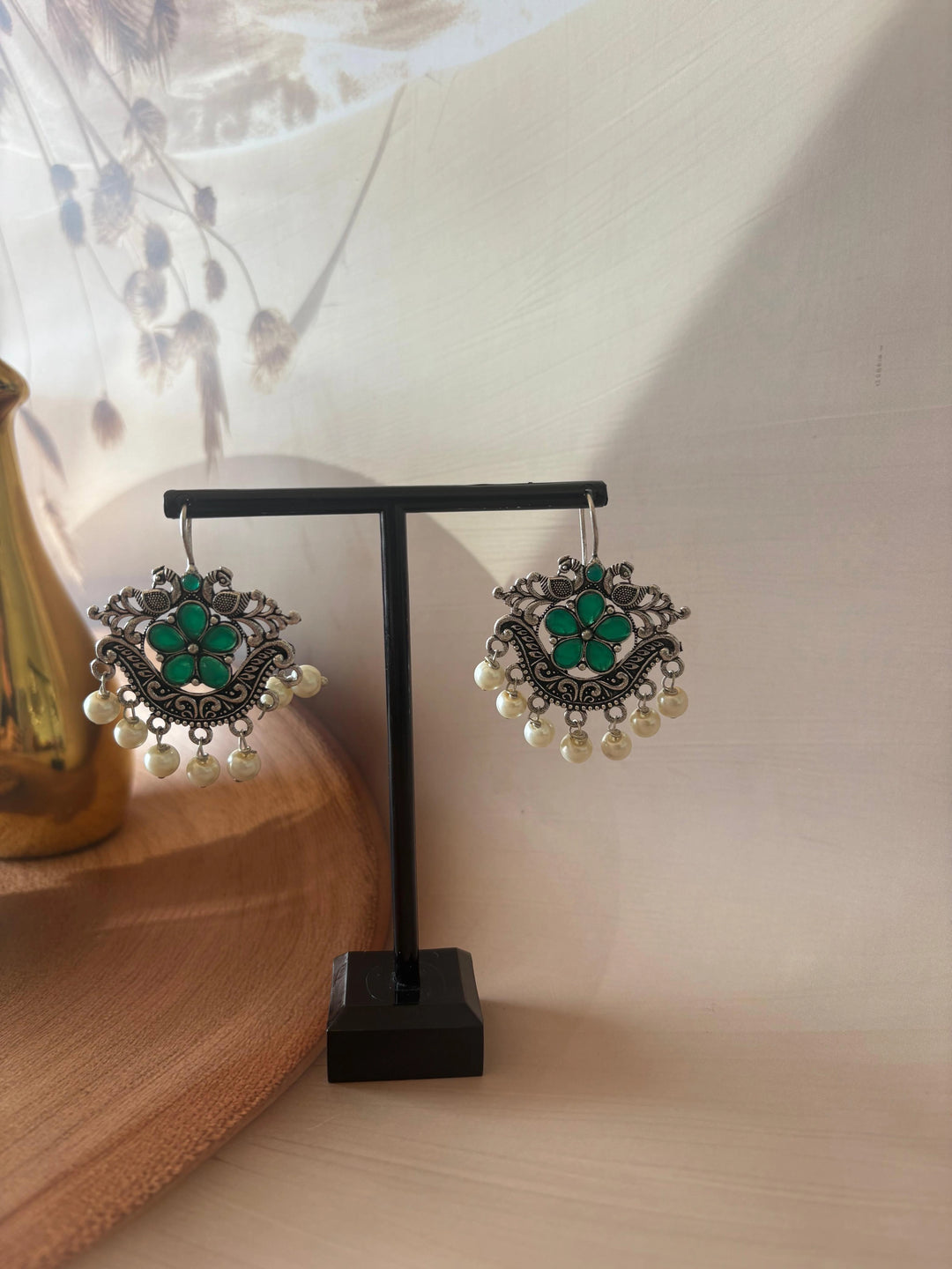 GREEN STONE SLIVER OXIDISED PEARL EARRING SET