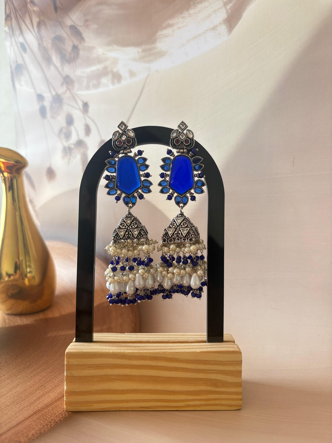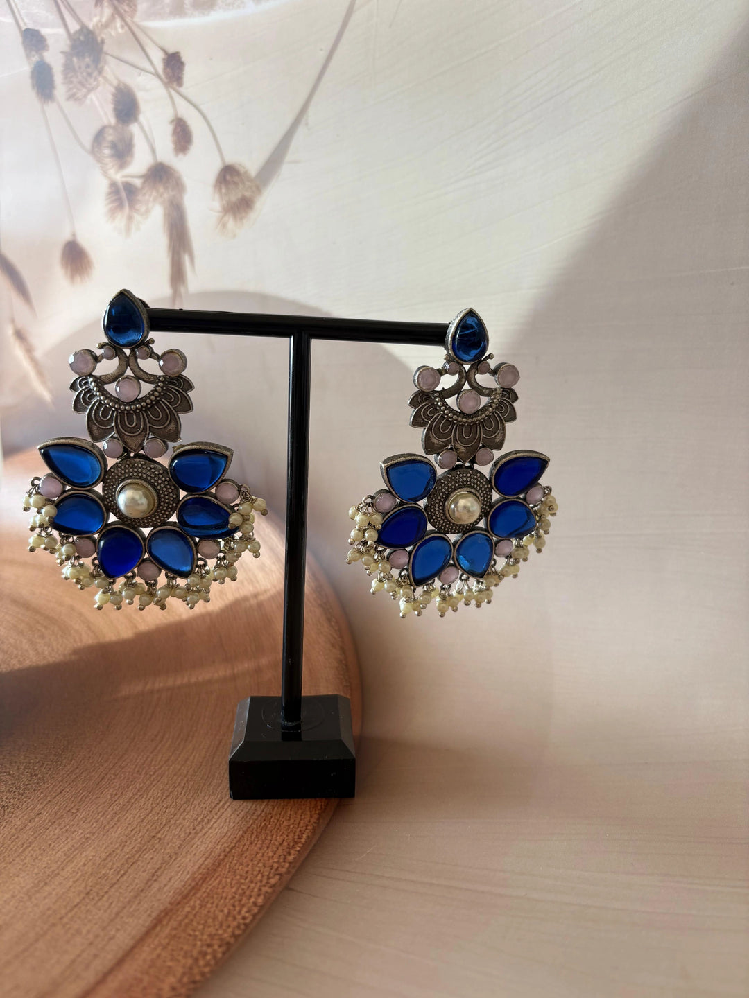 ROYAL BLUE SILVER OXIDISED STONE STUDDED EARRING SET