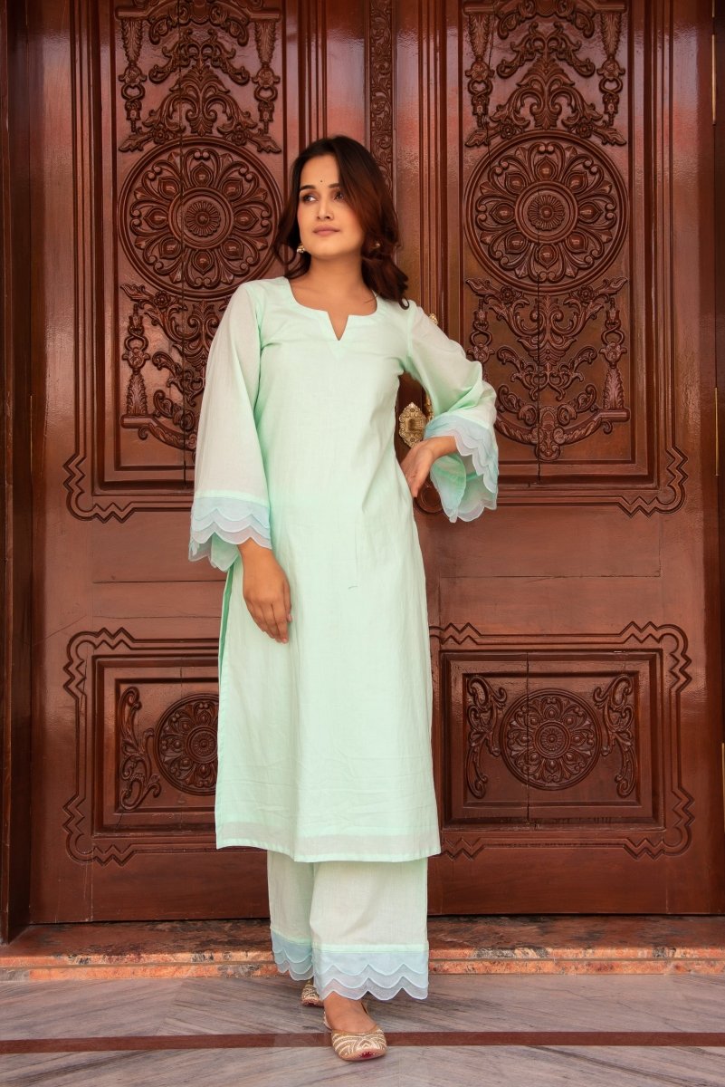 - SUNHARI AQUA BLUE COTTON CO-ORD SET WITH ORGANZA EMBROIDERY SLEEVES
