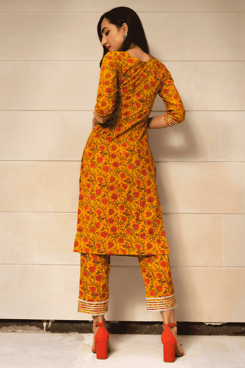 - MUSTARD YELLOW COTTON HAND BLOCK PRINT KURTA PANT SET WITH COTTON DUPATTA