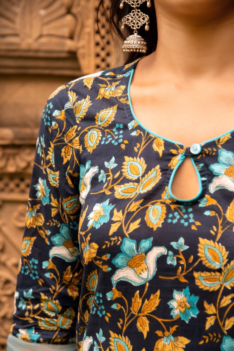 Nice color and cotton fabric overall. It fits perfectly and flare falls nicely. Got so many compliments!!! Shipping was fast and hassle free. Thanks POMCHA JAIPUR!!