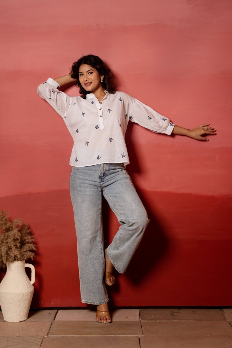 - RANG MALHAR BANDHEJ WHITE BLUE EMBROIDERY TOP