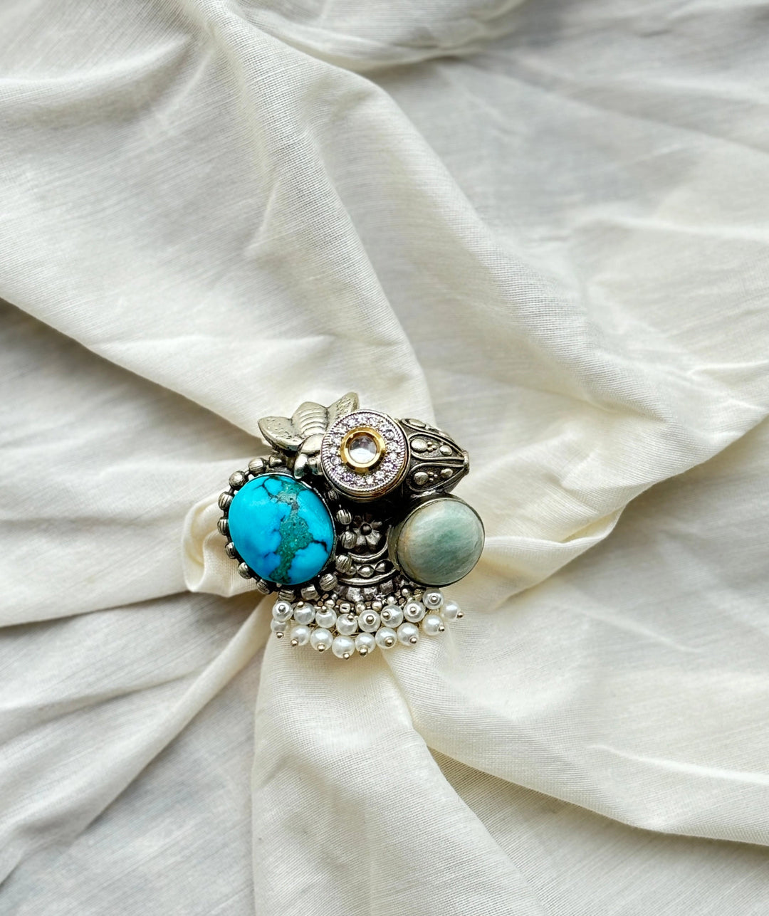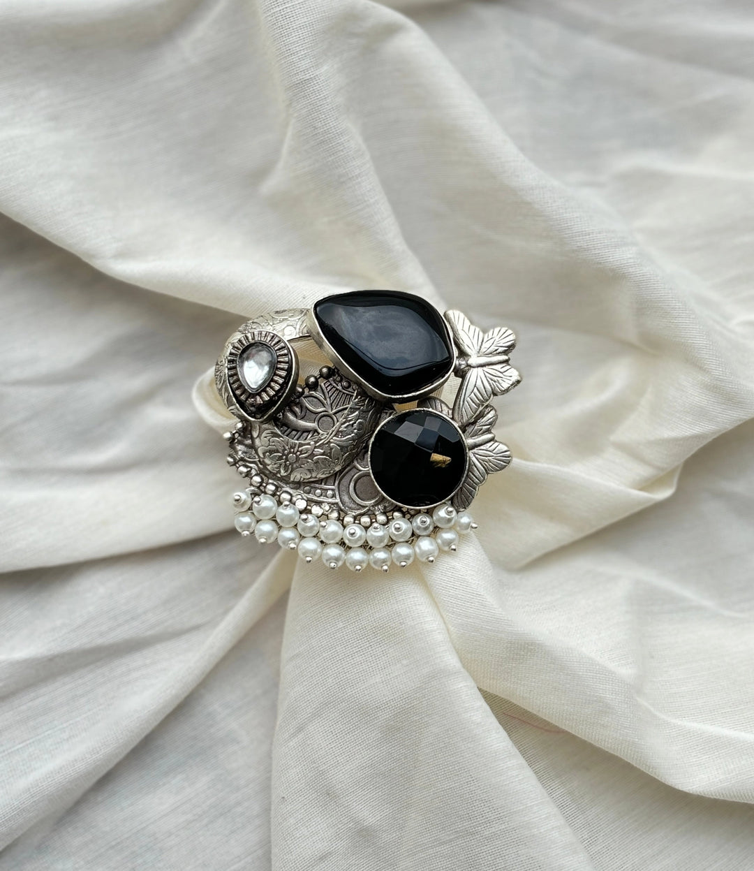 ORANGE STONE PEARL EMBEDDED SILVER OXIDISED RING