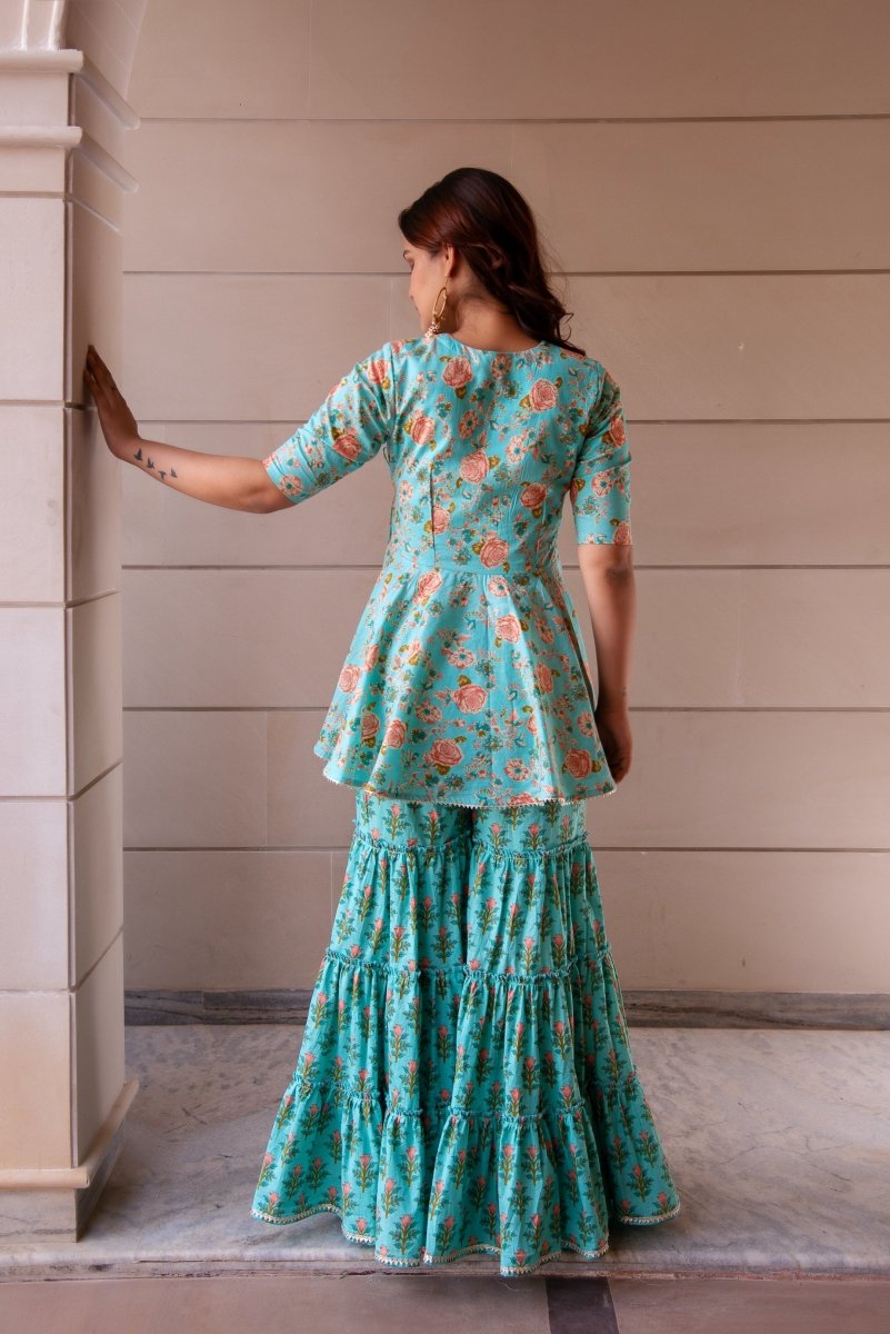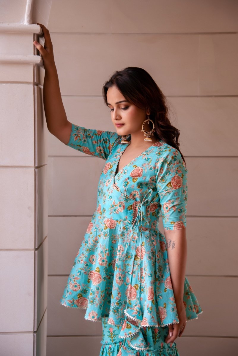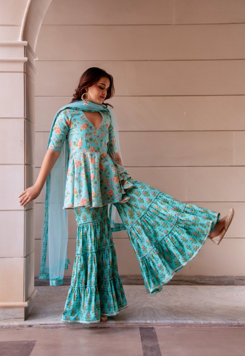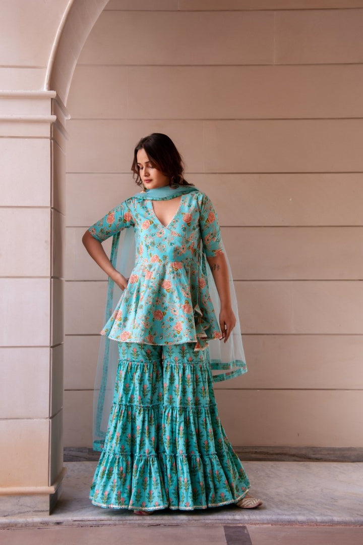 - SUNHARI CHHAVI HAND BLOCK PRINT LAYERED SHARARA SET WITH SOFT NET DUPATTA
