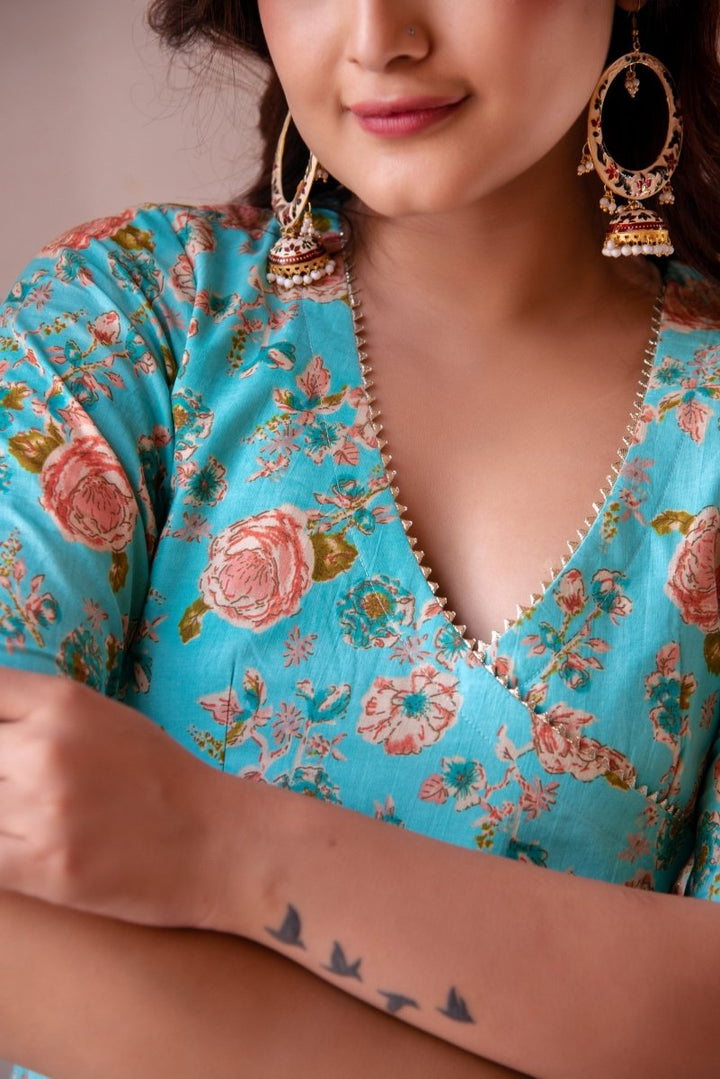 Nice color and cotton fabric overall. It fits perfectly and flare falls nicely. Got so many compliments!!! Shipping was fast and hassle free. Thanks POMCHA JAIPUR!!