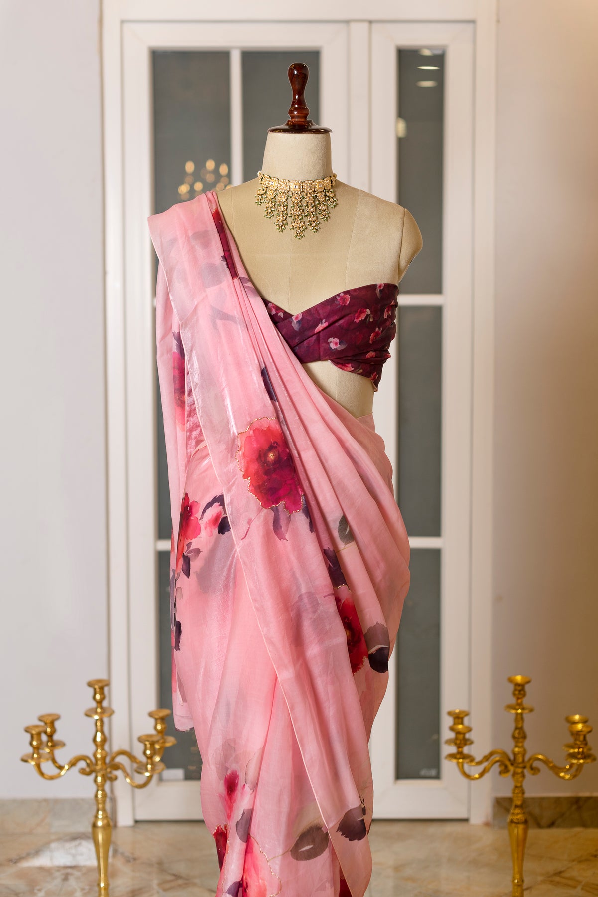 SOOT RAAG BLUSH PINK FLORAL PRINT SATIN SILK SAREE BLOUSE PIECE