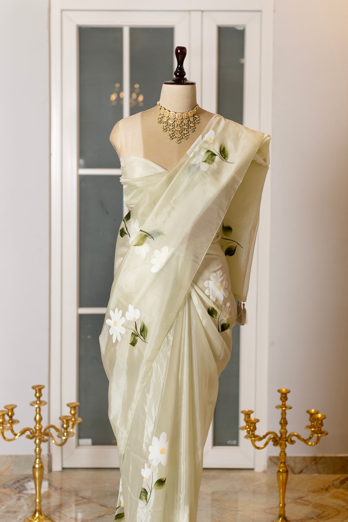 SOOT RAAG PISTAL GREEN ORGANZA FLORAL PAINTED SAREE WITH BLOUSE PIECE