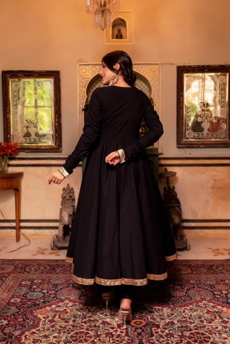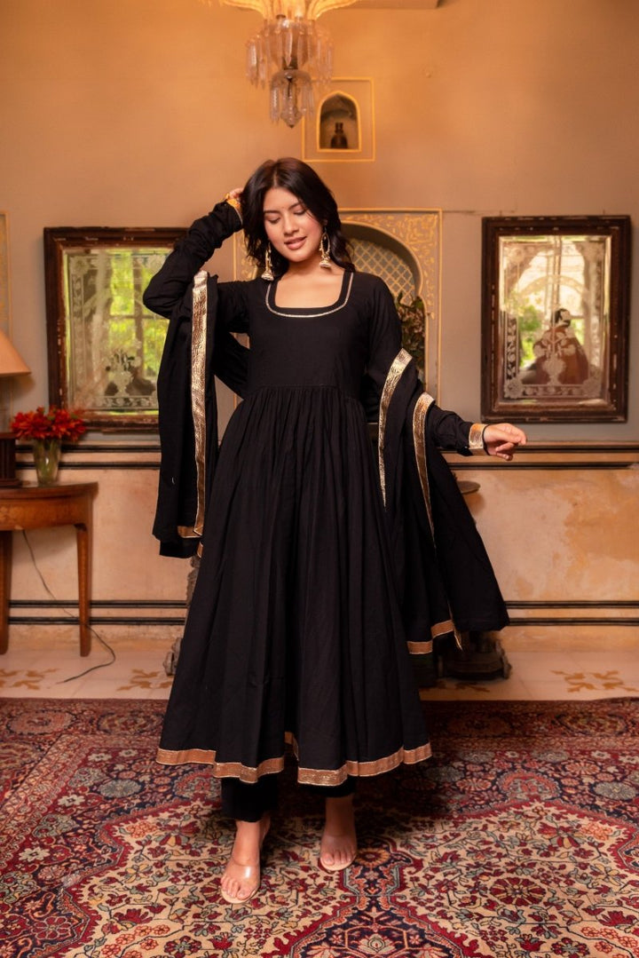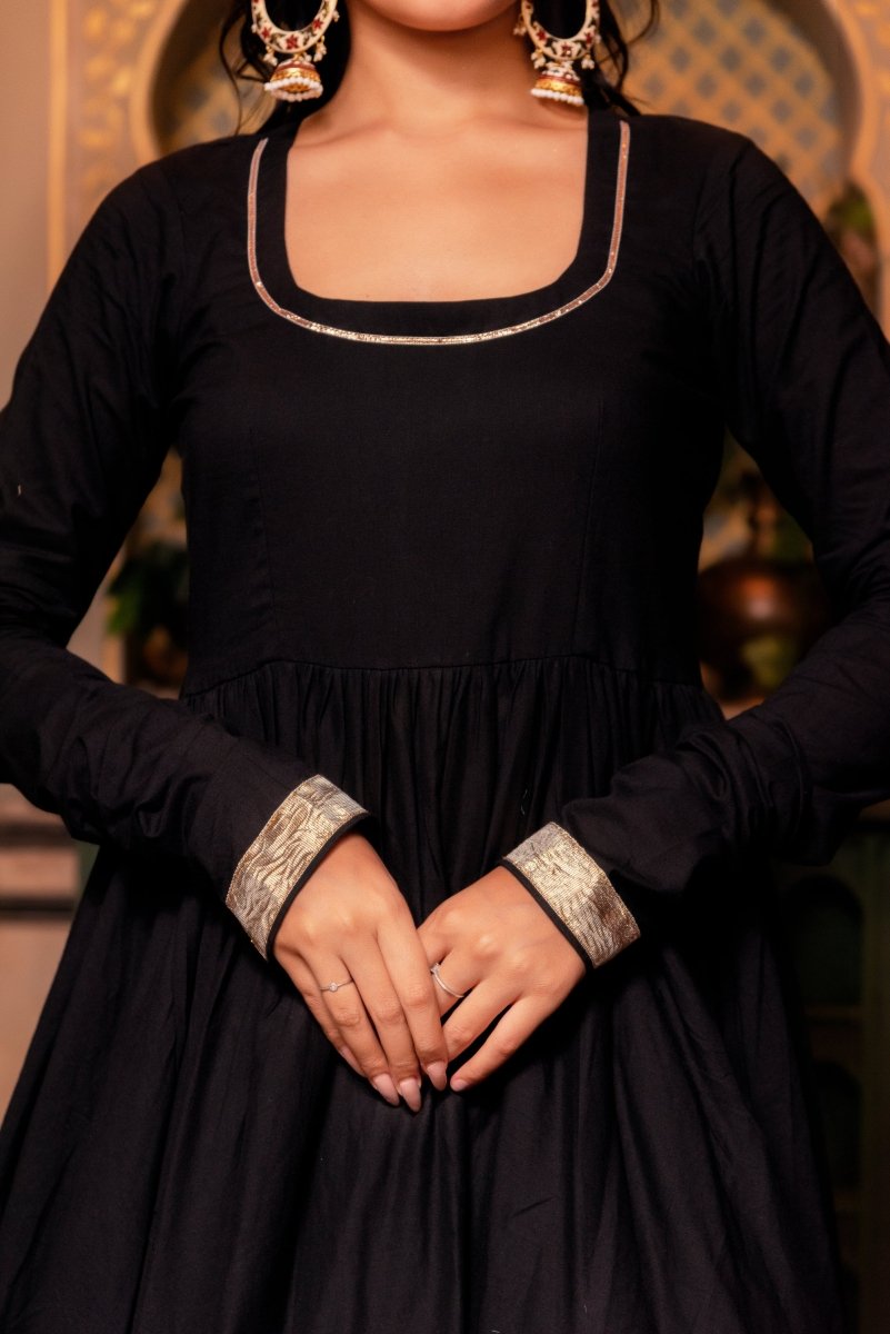 - SUNHARI MAHIRA BLACK COTTON GOTA PATTI ANARKALI SET WITH COTTON DUPATTA