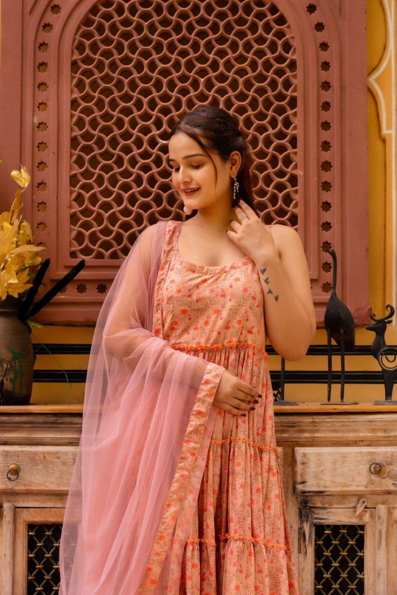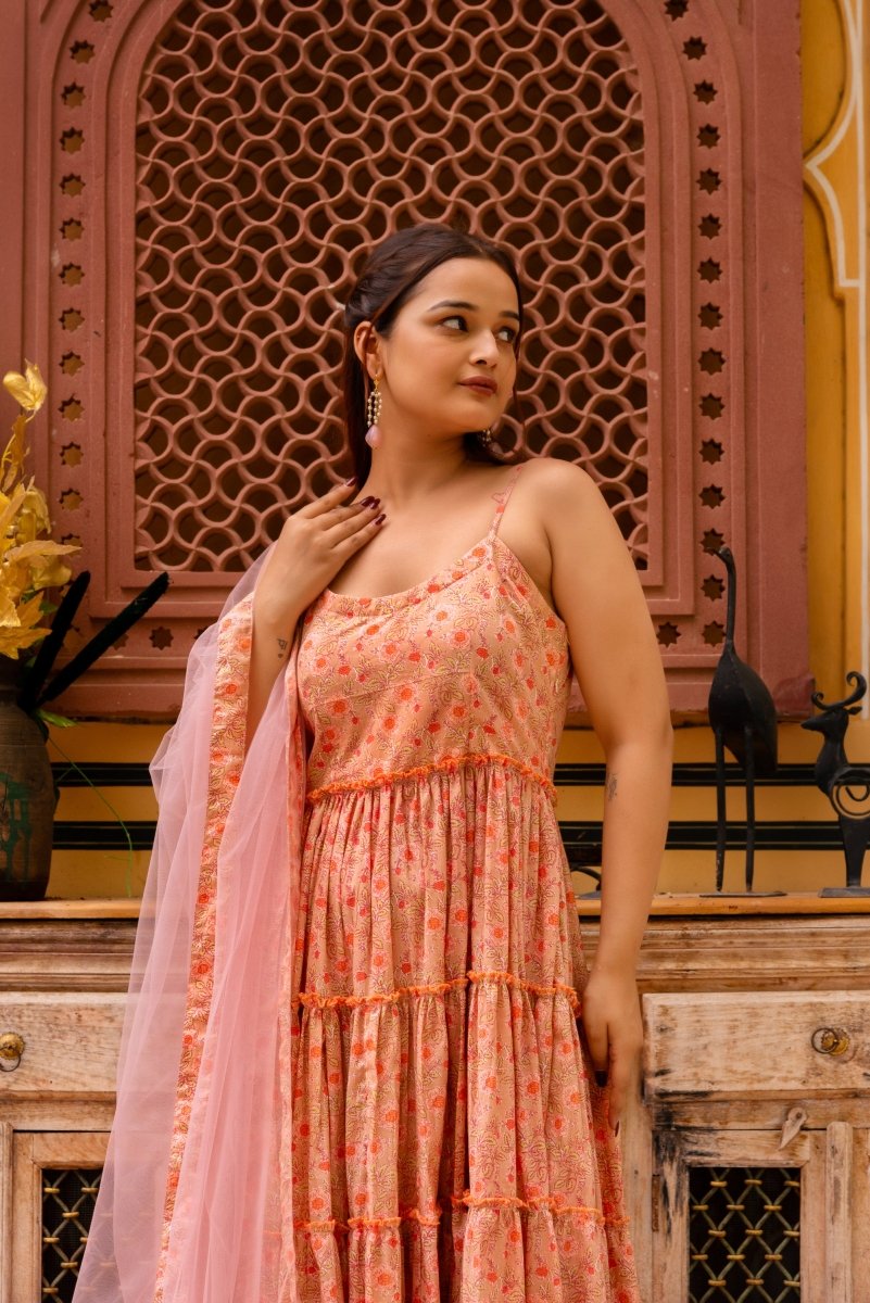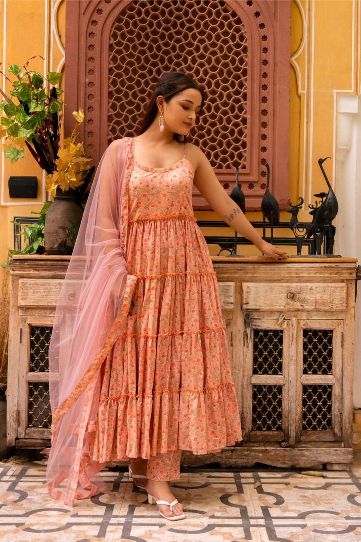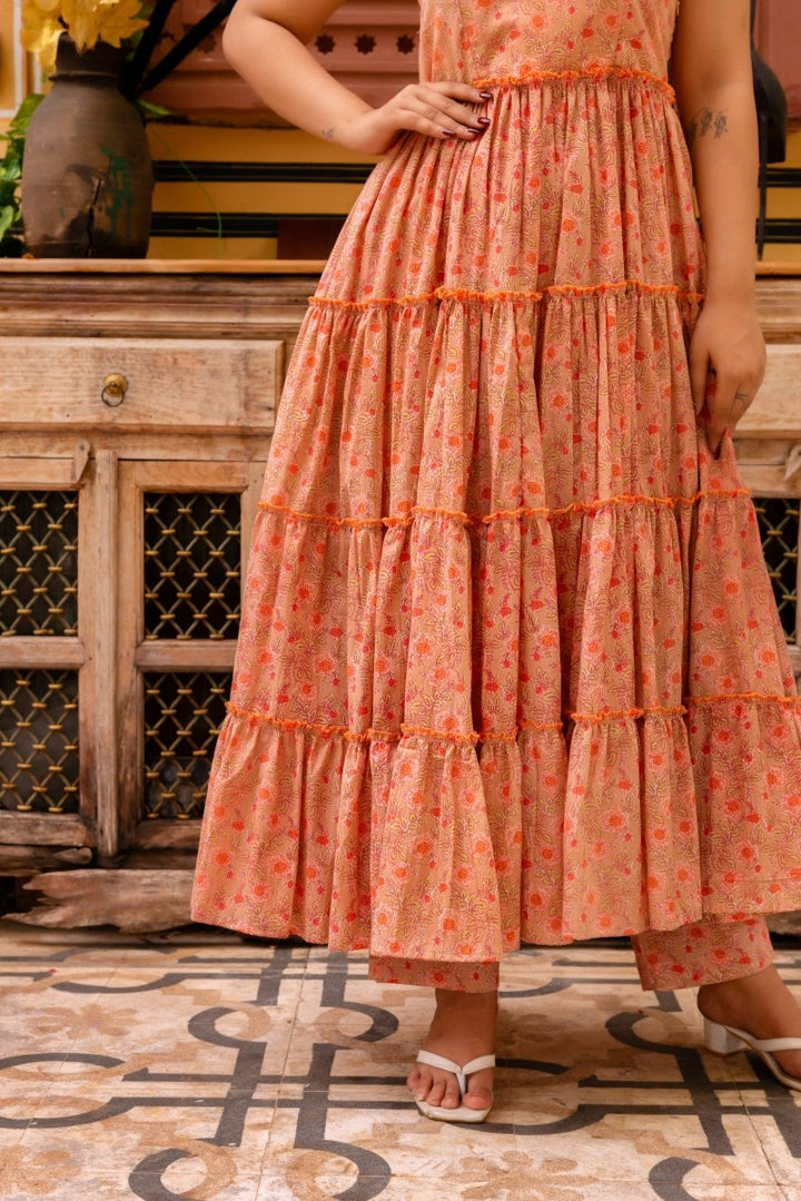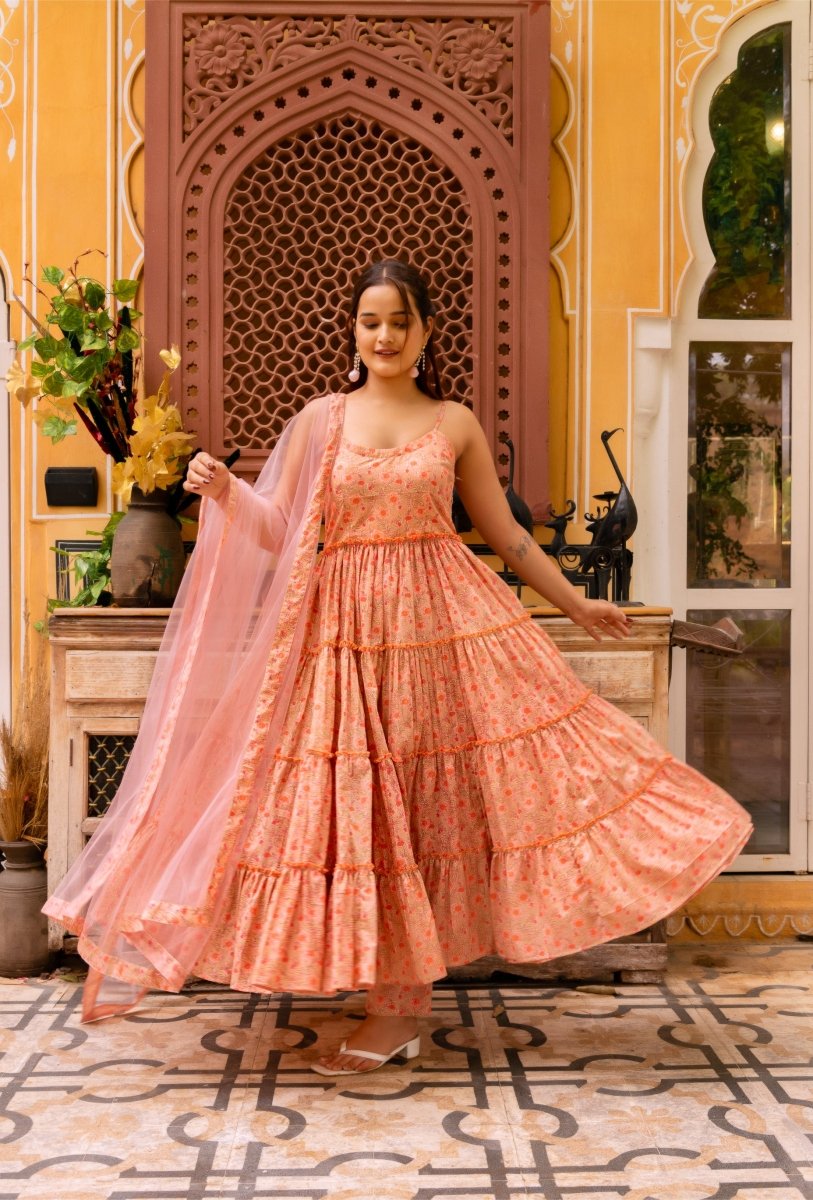 - SUNHARI PEACH HAND BLOCK PRINT COTTON TIERED ANARKALI WITH SOFT NET DUPATTA