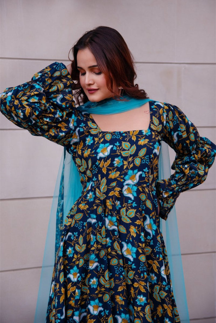 - SUNHARI BLUE COTTON HAND BLOCK ANARKALI SET WITH SOFT NET DUPATTA