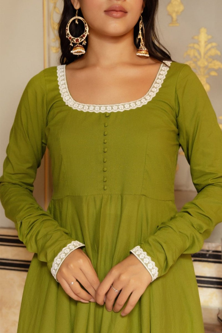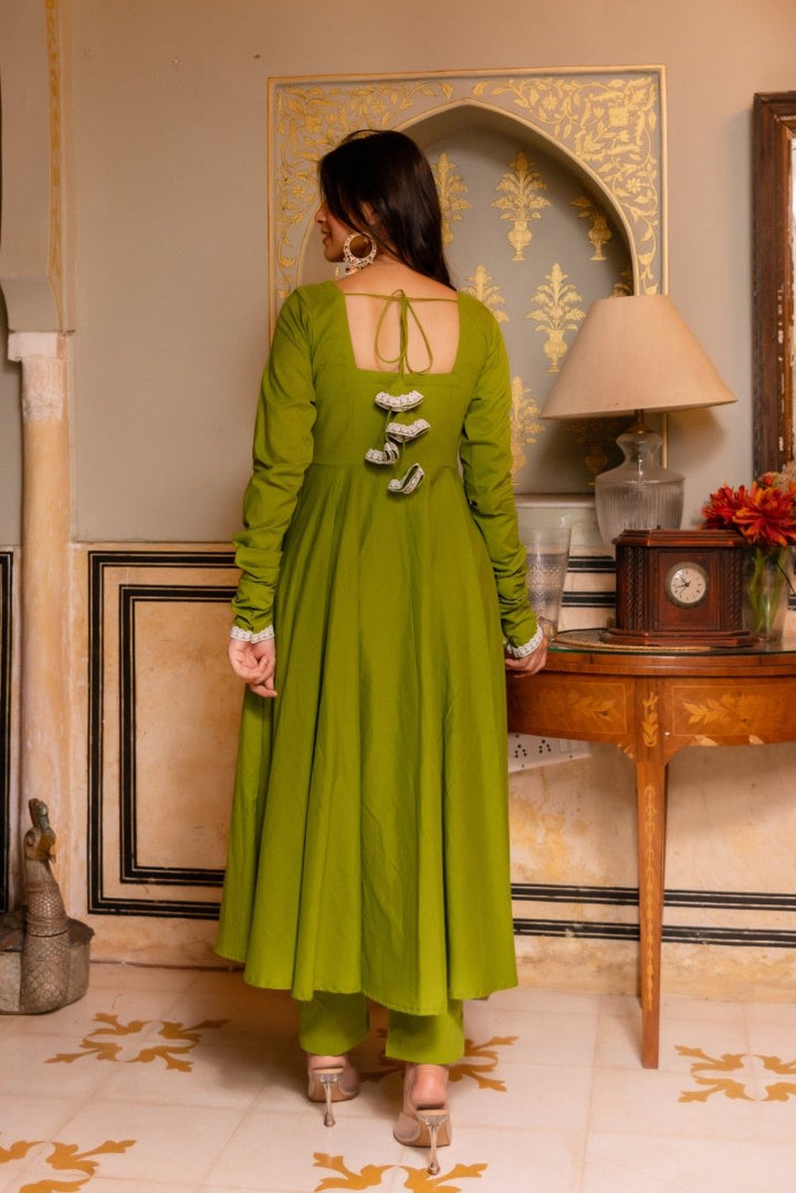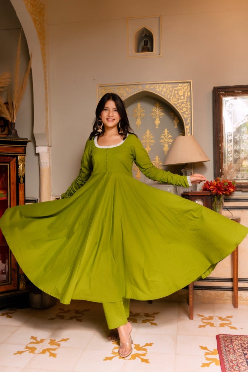 - SUNHARI GREEN COTTON EMBROIDERY ANARKALI SET WITH COTTON EMBROIDERED DUPATTA