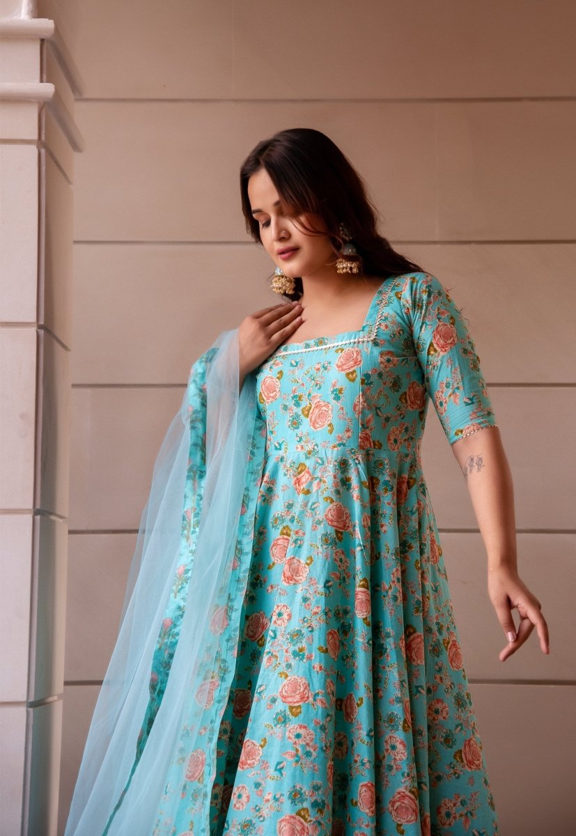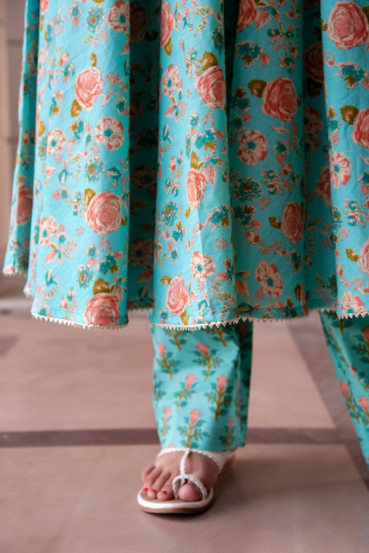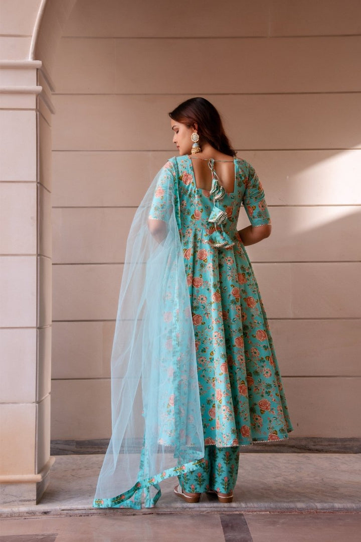 - SUNHARI PASTEL BLUE HAND BLOCK COTTON ANARKALI SET WITH SOFT NET DUPATTA