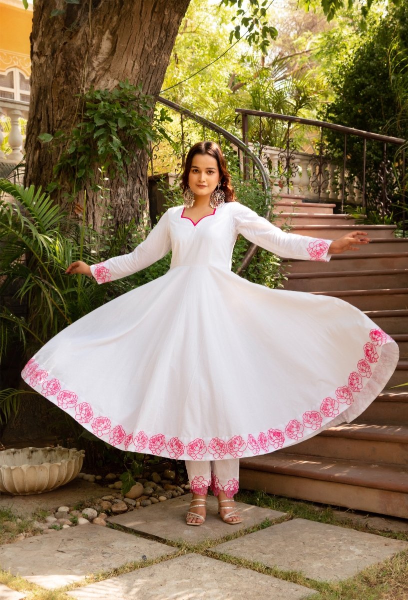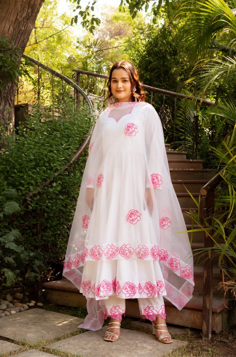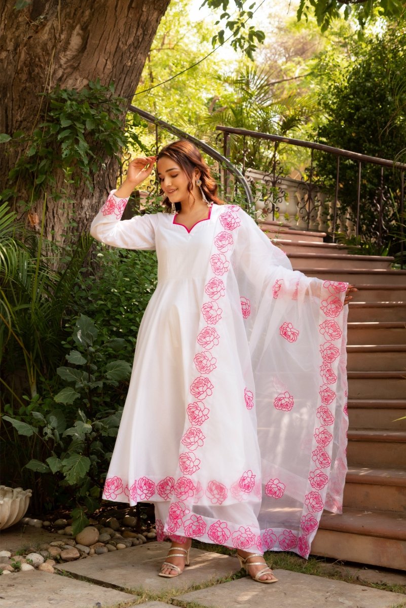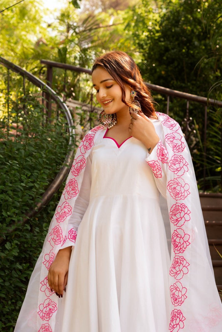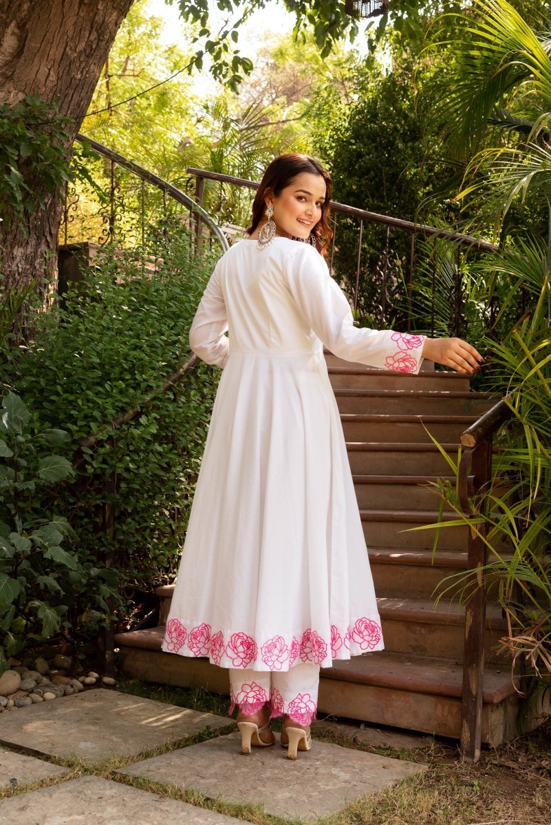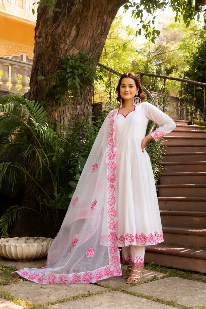 - SUNHARI WHITE PINK PHOOL COTTON EMBROIDERED ANARKALI SET WITH ORGANZA DUPATTA